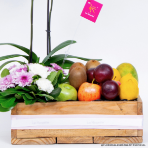 Flores: 1 Planta de Orquídeas, Pompom, Claveles y Follajes . Frutas: 3 ciruelas, 3 kiwis, 3 limones, 3 mangos, 5 manzanas